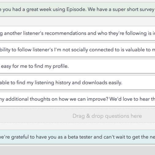 A weekly Wednesday release schedule was supported with an email driving listeners to perform specific tasks as beta testers. A short survey based on that week’s tasks was sent on Mondays.
