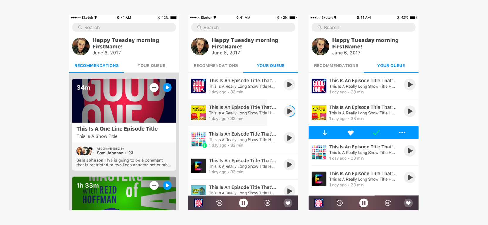 We spent time iterating queue ideas with the goal of learning what was crucial for a listener to perform the core action. We were on track until we got distracted by solving problems we assumed were there. Things like do listeners want a single item displaying in their queue at a time or the ability to browse many?